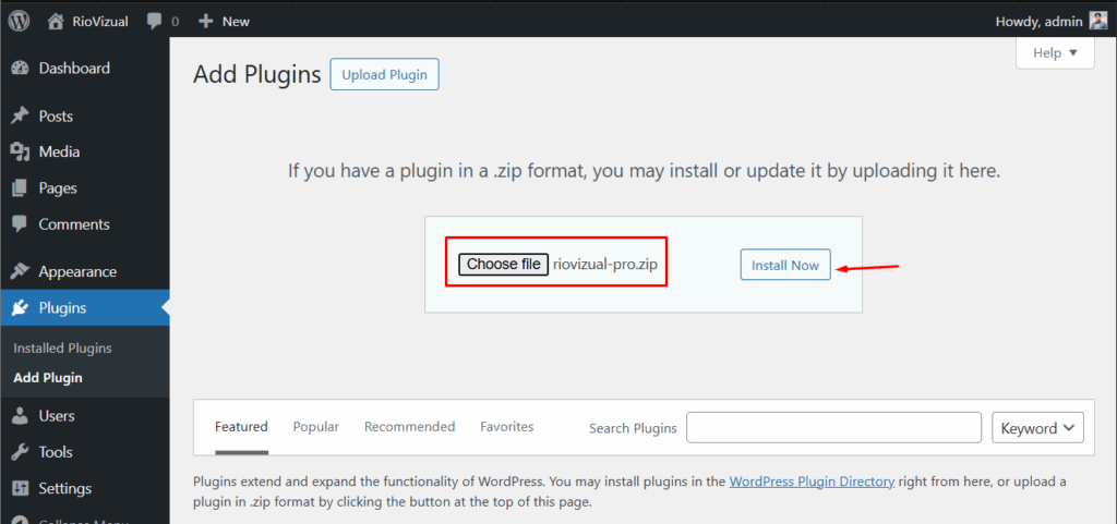 - Choose the Zip file of the plugin you have downloaded and click Install Now.