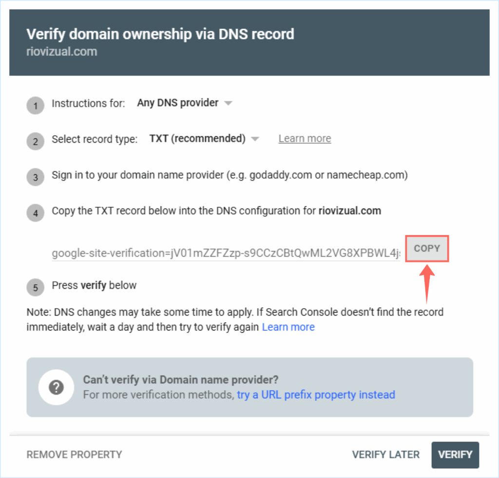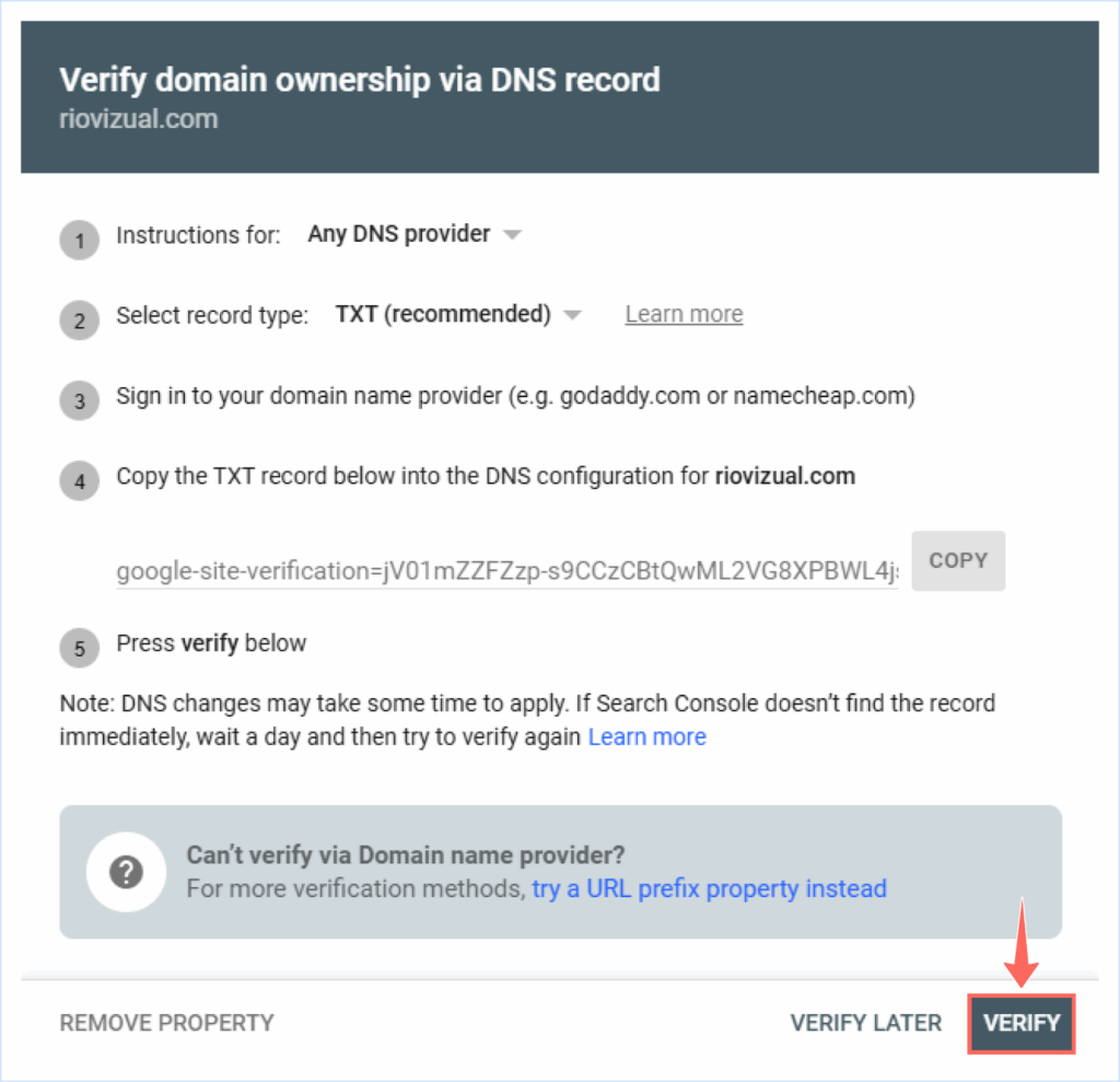 - Return to Google Search Console and click Verify.