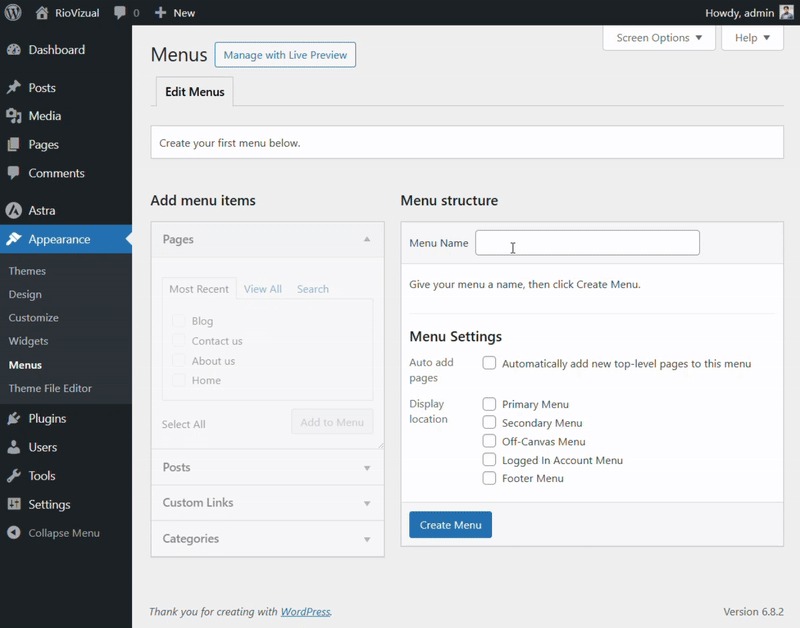 - Give a Menu Name (for identity and reuse later) and click Create Menu.